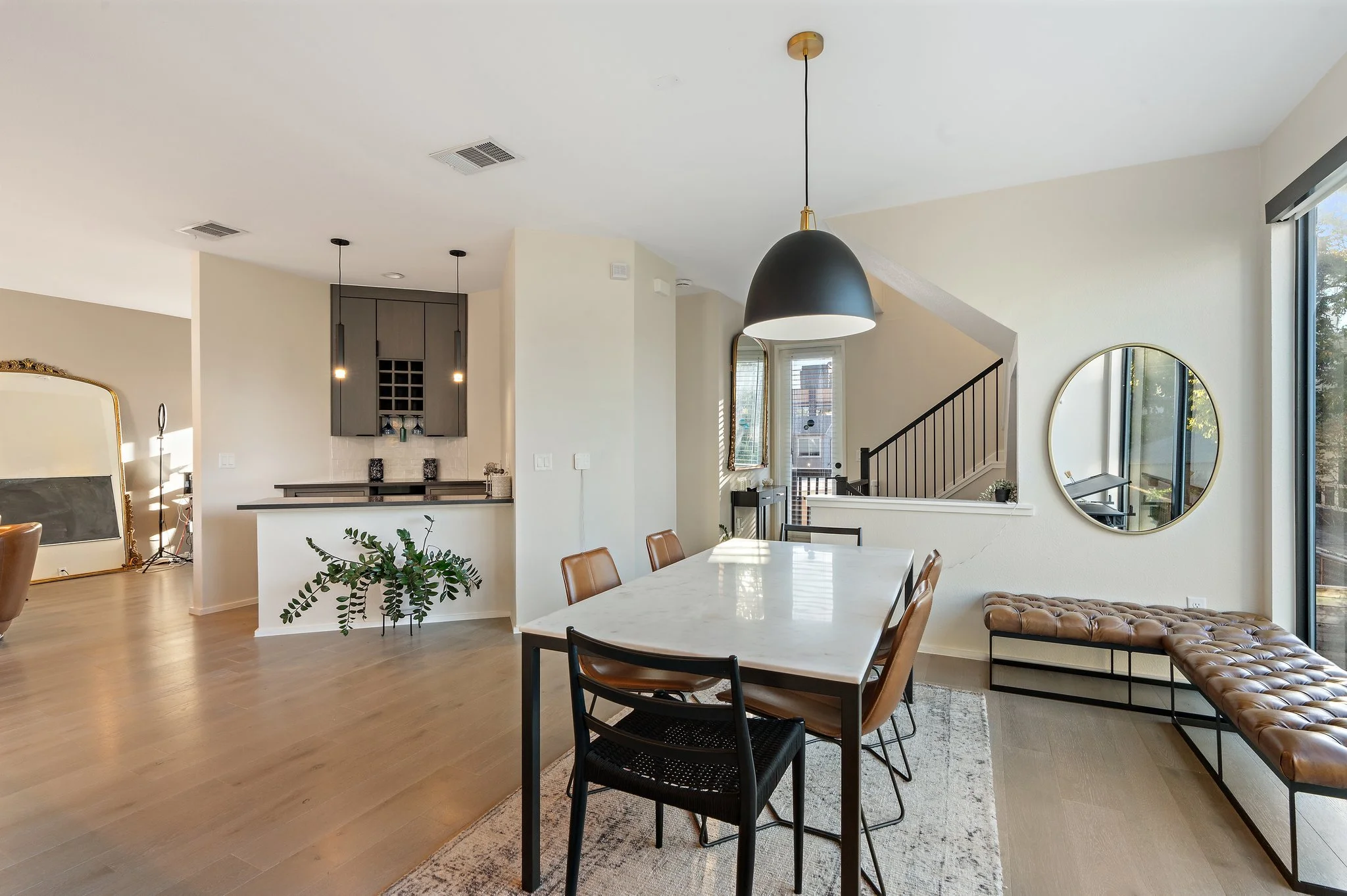In this unit, the interior has an open floor plan with lots of natural light. The first floor includes the garage and a flex space that could be used for an office, intimate sitting area, or storage. The second floor consists of the communal areas such as the living room, kitchen, dining room, bathroom, dry bar with built-in wine fridge, and balcony. The Third floor includes the more intimate spaces such as the bathrooms with attached bathrooms for each, laundry room, and a third floor balcony.